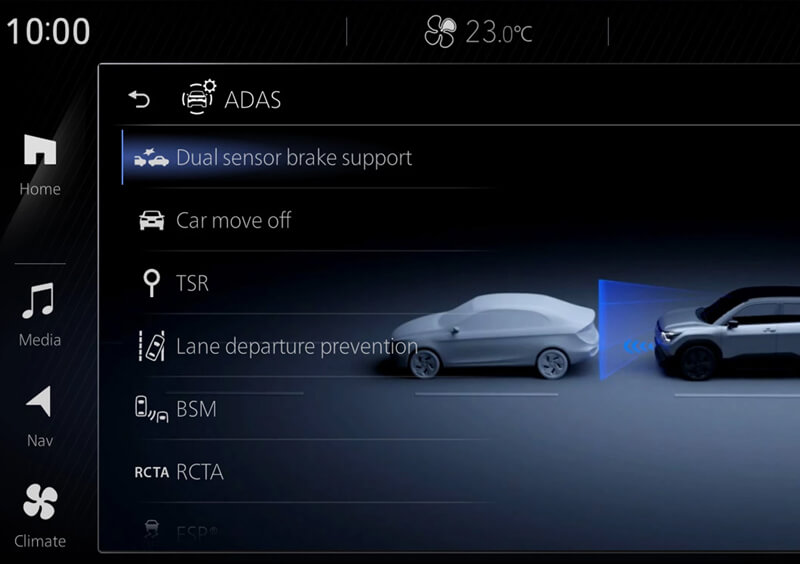 e-Vitara ozbiljno pristupa bezbednosti, koristeći napredne kamere i senzore za praćenje puta, vozila i pešaka, uz niz standardnih bezbednosnih funkcija koje vožnju čine sigurnijom i opuštenijom. Sistem za nadzor mrtvog ugla upozorava vozača kada se drugo vozilo nalazi u zoni koju je teško videti, olakšavajući bezbednu promenu trake. Dual Sensor Brake Support pomaže u izbegavanju sudara tako što detektuje prepreke i automatski aktivira kočnice ako je potrebno. Prilikom izlaska iz parkinga, Rear Cross Traffic Alert pruža glasovno upozorenje na vozila koja se približavaju sa strane, smanjujući stres u takvim situacijama. Tu su i sistemi za pomoć pri zadržavanju u traci i sprečavanje napuštanja trake, koji uključuju upozorenja i blagu korekciju upravljanja, uz dodatak adaptivnog tempomata za još udobniju vožnju.